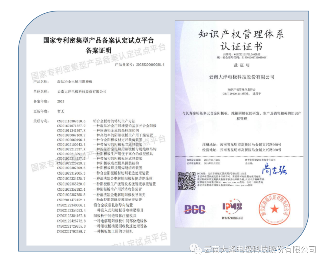 本次被認定的產(chǎn)品名稱是“濕法冶金電解用陽極板”,國家專利密集型產(chǎn)品備案號20235300000088.4。